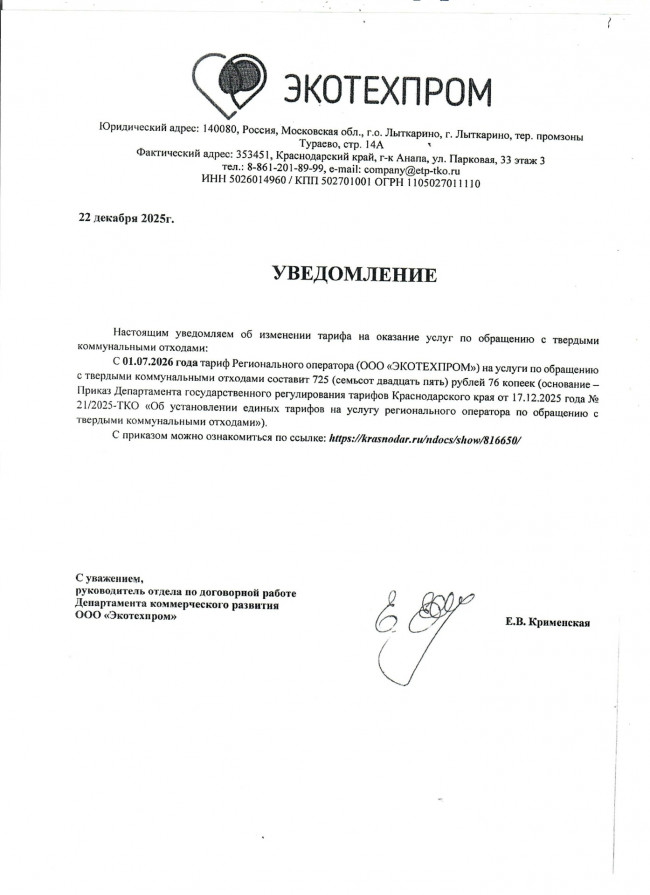 Уведомление об изменении тарифа ООО "Экотехпром"