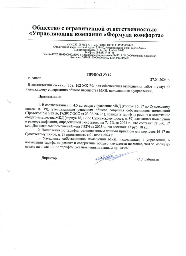 Приказ о повышении тарифа на ремонт и содержание общедомового имущества
